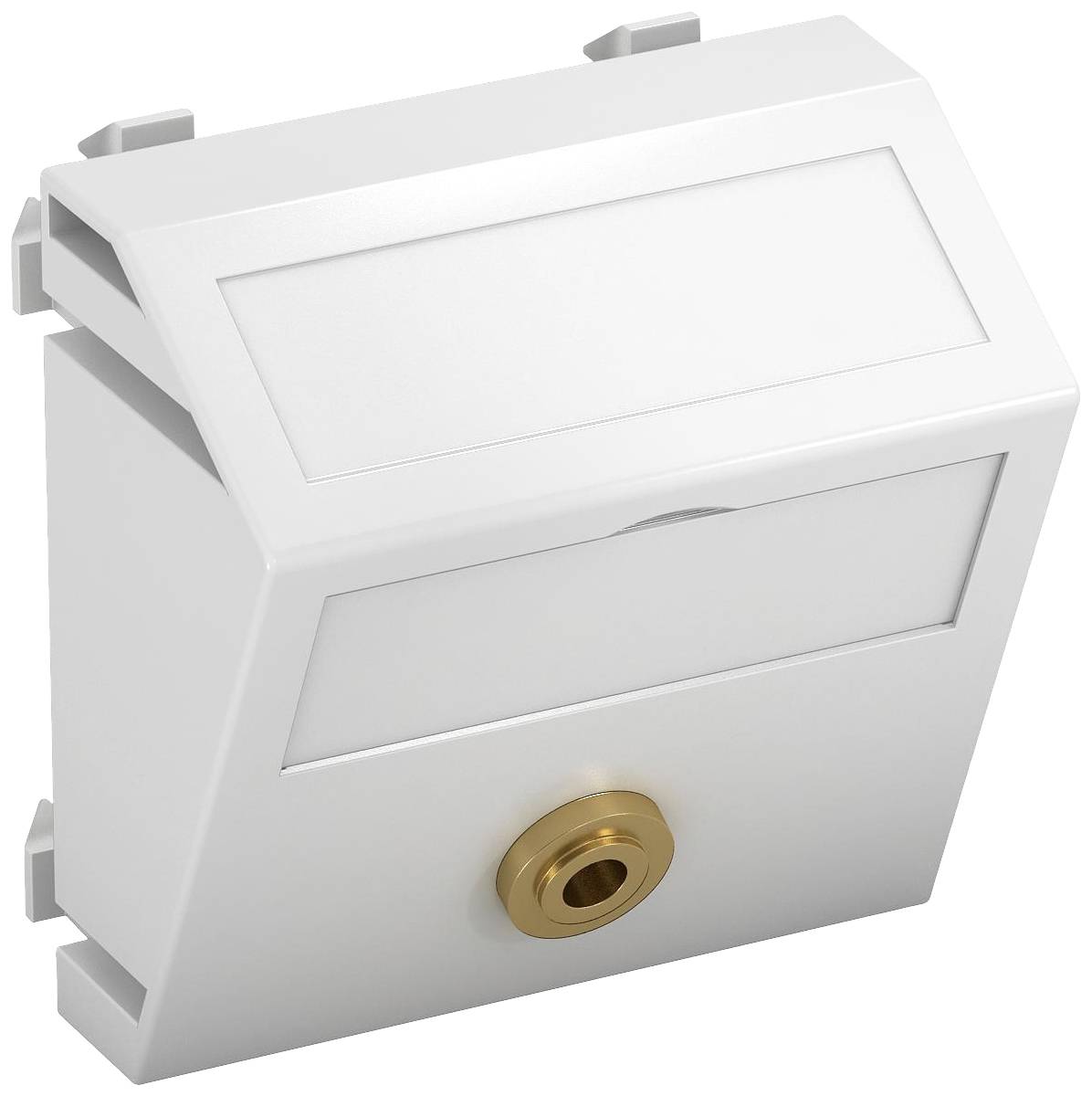 Nośnik multimedialny z gniazdem mini-jack, wyjście kablowe pod kątem, z polem opisowym, gniazdo mini-jack (TRS 3,5 mm) z przyłączem lutowanym. Płyta nośna z mocowaniem zatrzaskowym, odpowiednia do instalacji poziomej i pionowej w środowisku systemowym.