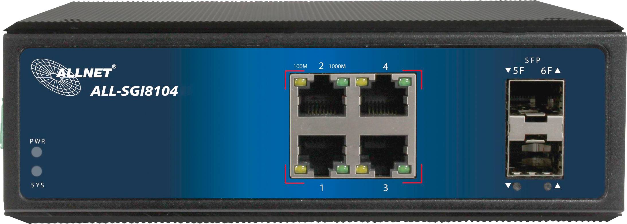 ALL-SGI_8104 to niezarządzalny 4-portowy Switch przemysłowy Gigabit z 2 gniazdami SFP.