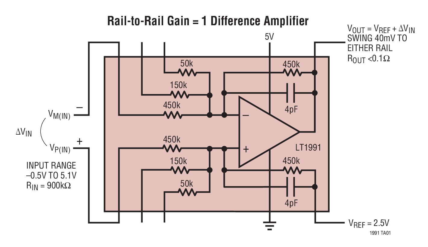 The LT1991 combines a precision operational amplifier with eight precision resistors to form a one-chip solution for accurately amplifying voltages. Gains from -13 to 14 with a gain accuracy of 0.04% can be achieved using no external components. The device is particularly well suited for use as a difference amplifier, where the excellent resistor matching results in a common mode rejection ratio of greater than 75dB.