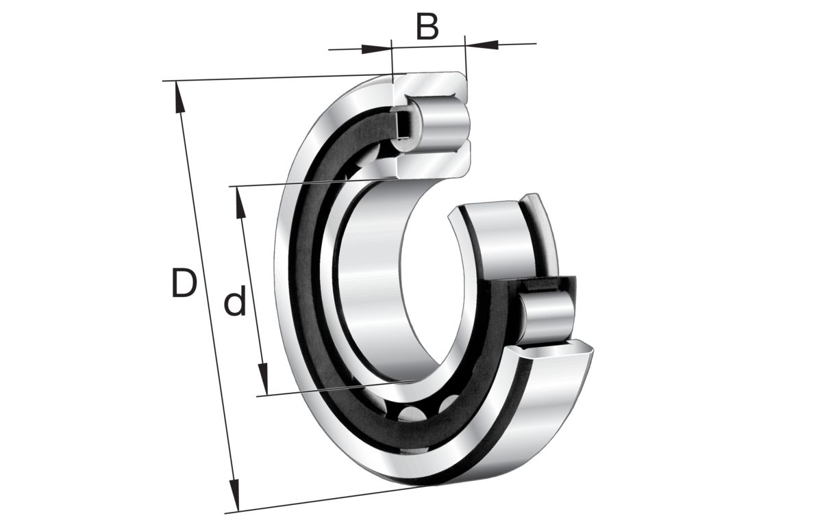 Cylindryczne łożysko rolkowe FAG NJ..-E-XL-TVP2 z klatką. Ma jednorzędowe łożysko półlokalizacyjne, 2 żebra na pierścieniu zewnętrznym, 1 żebra na pierścieniu wewnętrznym, typ NJ.