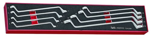 Zestaw podwójnych kluczy pierścieniowych Teng Tools jest wyposażony w uchwyt biodrowy umożliwiający kontakt z płaską stroną elementu mocującego, a narzędzia są utrzymywane w miejscu przy użyciu trzykolorowej ciętej pianki EVA.