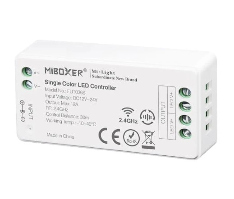 FUT036S to odświeżona wersja popularnego kontrolera FUT036M . Kontroler LED został rozbudowany o możliwość zmiany częstotliwości modulacji PWM oraz nowe funkcje dynamiczne . Dodatkowo kontroler ten posiada funkcję przekazywania i synchronizacji sygnału, co przy zachowaniu 30m odstępów pomiędzy kolejnymi urządzeniami, pozwala uzyskać nieskończony zasięg. Parametry pracy kontrolera synchronizują się automatycznie z innymi produktami znajdującymi się w grupie, pozwala to na uzyskanie identycznego efektu oświetlenia nawet wtedy kiedy produkty zostaną uruchomione w innym czasie. Moc kontrolera została zwiększona do 12A (144W przy instalacji 12V i 288W przy instalacji 24V). Wbudowaną dioda sygnalizacyjna, pozwala na szybką diagnozę oraz przypisanie kontrolera do pilota bez podłączania taśmy LED.