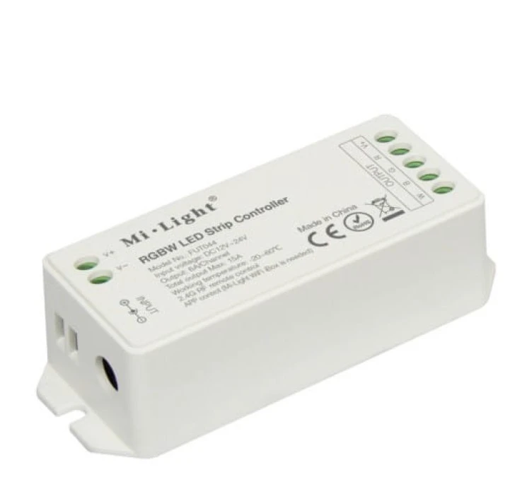 Ten produkt nie jest już produkowany, zamiennik: FUT038M Kontroler FUT044 Mi-Light jest urządzeniem przeznaczonym do współpracy z taśmami LED RGB+W. Kontroler LED RGB+W pozwala na płynną regulację jasności, koloru światła oraz saturacji . Sterowanie światłem białym odbywa się na wydzielonym do tego kanale. Praca urządzenia jest możliwa w zakresie 12-24V DC a maksymalna moc nie może przekroczyć 6A na kanał (72W przy instalacji 12V i 144W przy instalacji 24V) oraz 15A mocy całkowitej (180W przy instalacji 12V i 360W przy instalacji 24V). Kontroler LED może być sterowany za pomocą pilota lub aplikacji na smartfona (wymagany mostek Wi-Fi iBOX), Kontroler LED RGBW MI-Light może być sterowany nawet z 4 różnych urządzeń jednocześnie. Dodatkowo kontroler pełni funkcję repeatera , co przy zachowaniu 30m odstępów między kolejnymi kontro