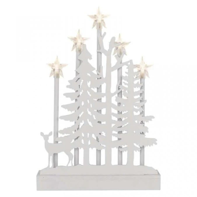 produkt: świecznik, barwa światła: ciepła biel, wymiary: 24 × 35,5 cm, zastosowanie: wewnętrzne, timer, pilot zdalnego sterowania: nie, typ zasilania: baterie (2× AA), źródło światła: LED, ilość LED: 5, moc: 0,3 W, napięcie wyjściowe: 3 V DC, stopień ochrony: IP20, żywotność: 10 000 godzin, materiał: drewniany, okres gwarancyjny: 2 lata, opakowanie: 1 szt., pudełko