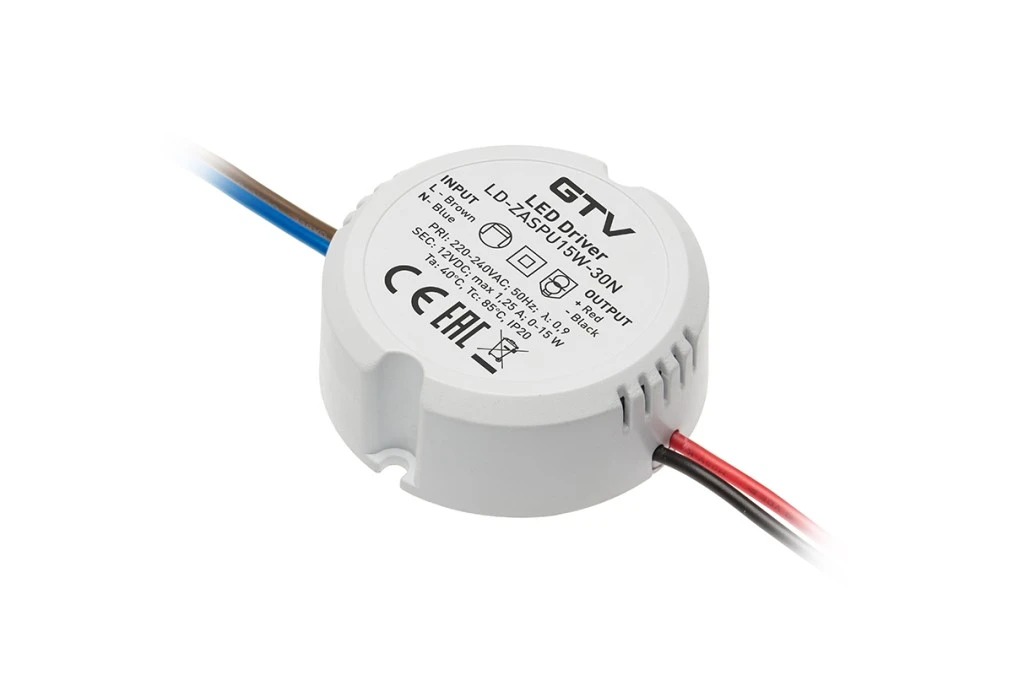 Zasilacz LED puszkowy 12V,15W, input 220-240VAC, IP20, wym.fi55 x 21mm z przewodami 100mm