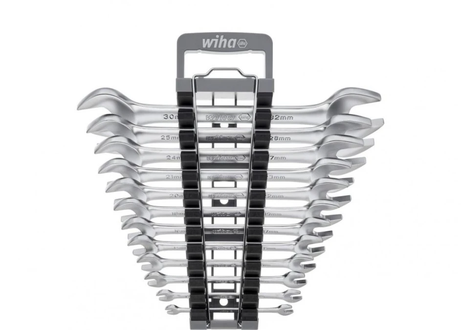 Zestaw obejmuje 12 najczęściej używanych rozmiarów, od 6 do 32 mm, umieszczonych w praktycznym uchwycie. Uchwyt można otworzyć jedną ręką i łatwo wyjąć klucz w potrzebnym rozmiarze.