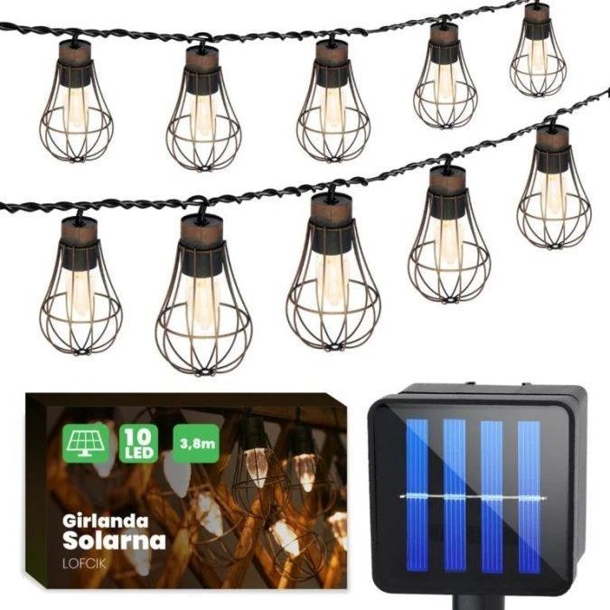 Girlanda solarna ogrodowa 3.8m - 10 wiszących drucianych żarówek Girlanda solarna LOFCIK w kolorze patyny, sprawdzi się jako dekoracyjne i praktyczne oświetlenie Twojego ogrodu. Żarówkowy kształt oprawek solarnych, świetnie podkreśli towarzystwo większych roślin zielonych. Lampki, mieszczą się na czarnym przewodzie o długości 3,8 metra.