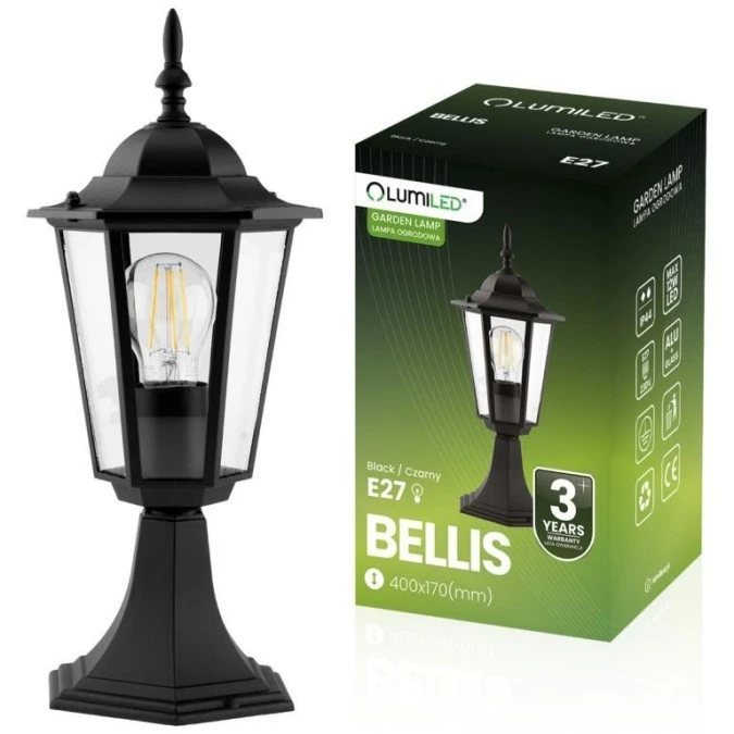 Lampa Ogrodowa Zewnętrzna E27 SŁUPEK LATARNIA 40cm Czarna BELLIS LUMILED Lampa Ogrodowa, Słupek Zewnętrzny serii BELLIS marki LUMILED o wysokości 42 cm w kształcie latarni w kolorze czarnym. Lampa wykonana z wysokiej jakości aluminium oraz szkła. Zastosowanie stopu aluminium do produkcji lampy sprawia, że jest ona lekka, wytrzymała oraz odporna na korozję. Lampa z wymiennym źródłem światła została wyposażona w popularny trzonek E27 - maksymalna moc nie może przekraczać 12W LED. Lampa BELLIS została wykonana z dużą dbałością o szczegóły z połączenia wysokiej jakości aluminium i szkła. Dzięki temu nie tylko wygląda bardzo stylowo, ale także zachowuje pełną estetykę przez wiele lat. Lampa została wyposażona w popularny trzonek (gwint) E27, dzięki czemu mamy możliwość dobrania żarówek LED i tradycyjnych odpowiedniej mocy i barwy światła wedle naszych potrzeb, jednakże maksymalna moc źródła światła nie może przekraczać 12W LED. Lumiled® to marka oświetleniowa oficjalnie zarejestrowana w europejskim systemie EUIPO. Lumiled® na polskim rynku od ponad 10lat dba o zadowolenie klienta. Główne zalety produktu: Elegancki i stylowy wygląd Wymienne źródło światła Popularny gwint na żarówki E27 o max. mocy 12W . Łatwość montażu Odporność na zachlapania - IP44 Produkt wykonany z wysokiej jakości metalu z dbałością o każdy detal Luksusowa i efektowna konstrukcja Szerokie zastosowanie lampy Lampy Lumiled zaprojektowane zostały pod kątem wilgotnych miejsc i zostały poddane testom, które potwierdziły ich odporność na wodę. Lampa cechuje się klasą wodoszczelności IP44 oznacza to, że jest odporna na zachlapania i wnikaniem pyłów, co sprawia, że jest idealną lampą do zastosowań zewnętrznych. Kilka przykładów zastosowań: Oświetlenie chodnika - zamontowanie lampy w wzdłuż chodnika lub ścieżki ogrodowej, jest bardzo ciekawym rozwiązaniem, które zapewni ich dobre oświetlenie, tworząc unikalny nastrój. Oświetlenie ogrodu/ tarasu - dobrze oświetlony ogród sprawi, że Twoje rośliny będą równie pięknie wyglądać po zmroku co w promieniach słońca, a wieczorne spotkania z rodziną i przyjaciółmi będą odbywać się w przytulnej i kameralnej atmosferze. UWAGA! Brak źródła światła w komplecie.