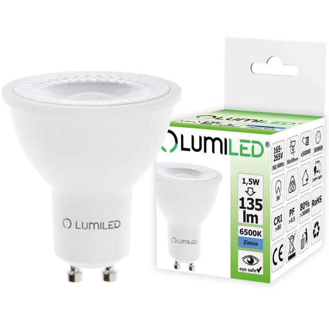Żarówka LED renomowanej i uznanej w branży oświetleniowej marki Lumiled w kształcie reflektoru z trzonkiem GU10 i mocy 1,5W. Żarówka doskonale sprawdzi się w każdym gospodarstwie domowym, sklepie, hotelu czy restauracji jako oświetlenie akcentowe lub dekoracyjne i może być montowana we wszystkich tradycyjnych Oprawach, które wyposażone są w trzonek GU10 . Lumiled® to marka oświetleniowa oficjalnie zarejestrowana w europejskim systemie EUIPO. Lumiled® na polskim rynku od ponad 10lat dba o zadowolenie klienta, zapewniając: Najwyższą jakość światła oraz bezpieczeństwo wzroku. Zastosowanie selekcjonowanych komponentów oraz najwyższej jakości materiałów. Do produkcji żarówek zastosowane zostały najnowsze i najlepsze technologie dostępne na rynku. Jakość marki potwierdzają liczne pozytywne opinie klientów. KORZYŚCI Z ZASTOSOWANIA PRODUKTU: Niskie koszty eksploatacji 15 000h godzin co daje nawet 2-lata ciągłego świecenia Ochrona środowiska naturalnego - brak zawartości rtęci i innych szkodliwych substancji Niska Emisja ciepła Do 90% mniejsze o zużycie energii elektrycznej względem standardowych źródeł światła Wydłużony czas - 25 razy dłużej od zwykłych żarówek i aż 10 razy dłużej w porównaniu do żarówek halogenowych STABILNOŚĆ I BEZPIECZEŃSTWO DLA OCZU: Zastosowana przetwornica CCD w żarówce LED sprawia, że żarówka jest odporna na spadki i wzrosty napięcia w sieci. Światło nie migocze, ani nie drży. Przetwornica CCD sprawia, że żarówka jest bezawaryjna przez długi czas. Żarówki LUMILED zaprojektowane zostały z myślą o jej użytkownikach. Słaba jakość oświetlenia może prowadzić do zmęczenia oczu dlatego nasze Żarówki posiadają opracowanie techniczne Eye Safe zapewnią komfortowe i przyjazne oświetlenie twoim oczom w każdym pomieszczeniQu. WYSOKA JAKOŚĆ EMITOWANEGO ŚWIATŁA: Żarówka świeci jednolitym światłem, które zapewnia wspaniały widok w Twoim domu i tworzy relaksującą, ciepłą atmosferę. CRI (Współczynnik oddawania barw) wynosi ponad 80, co zapewnia bardziej żywe i bardziej naturalne światło. Zaletą żarówek LED jest różnorodność barw światła co pozwoli nam dostosować pomieszczenie do naszych potrzeb. OBSZARY ZASTOSOWAŃ: Sklepy i pomieszczenia wystawowe Zastosowania domowe Zastosowania komercyjne Oświetlenie akcentujące Eksploatacja na zewnątrz wyłącznie w Oprawach zewnętrznych (co najmniej IP44)
