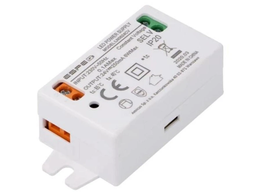 Zasilacz impulsowy LED 6W 24VDC 250mA 220÷240VAC IP20 OUT 1 LN0624CV