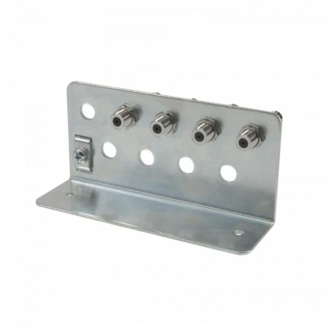 Ocynkowana stalowa płyta z 9 żeńskimi złączami przejściowymi F-F do podłączenia urządzenia do uziemienia. Izolacja złączy pozwala przekierować możliwe wyładowania atmosferyczne, które mogłyby uszkodzić urządzenie.