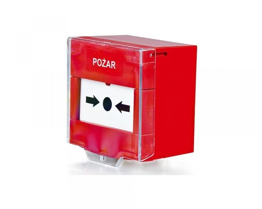 Obudowa z tworzywa i ustandaryzowany kolor czerwieni specjalnie zaaplikowane zostały dla dobrej widoczności urządzenia. Dodatkowo zamontowana przeźroczysta klapka zabezpiecza przycisk przed przypadkowym uruchomieniem. Montaż naścienny.
