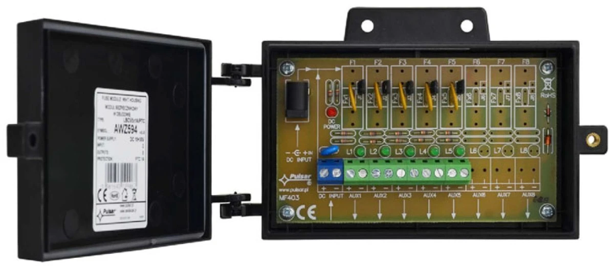 Moduł bezpiecznikowy Dedykowany do systemów CCTV Napięcie: 10V ÷ 30V DC Wejścia: 2x DC 5.5/2.1 lub złącze śrubowe Wyjścia: 5x AUX Zabezpieczenia: przeciwzwarciowe przeciążeniowe przepięciowe Syngalizacja LED II klasa środowiskowa, CE Obudowa na dwa wkręty