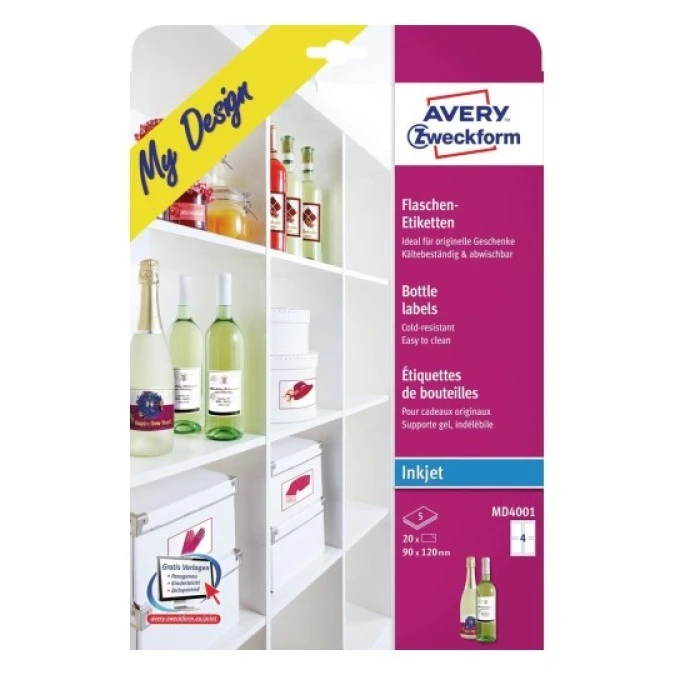 Etykiety na butelki białe papierowe 90 x 120 mm 20 etykiet na 5 arkuszach A4 AVERY Zweckfrom MD4001