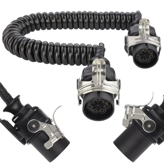 Wysokiej jakości spiralny przewód samochodowy, zakończony wtyczkami 7-pinowymi , stosowany do podłączenia systemu EBS/ABS pomiędzy ciągnikiem, a naczepą lub przyczepą o dużej ładowności. Zapewnia stałe połączenie instalacji 24V gwarantując nieprzerwane działanie EBS/ABS podczas jazdy.