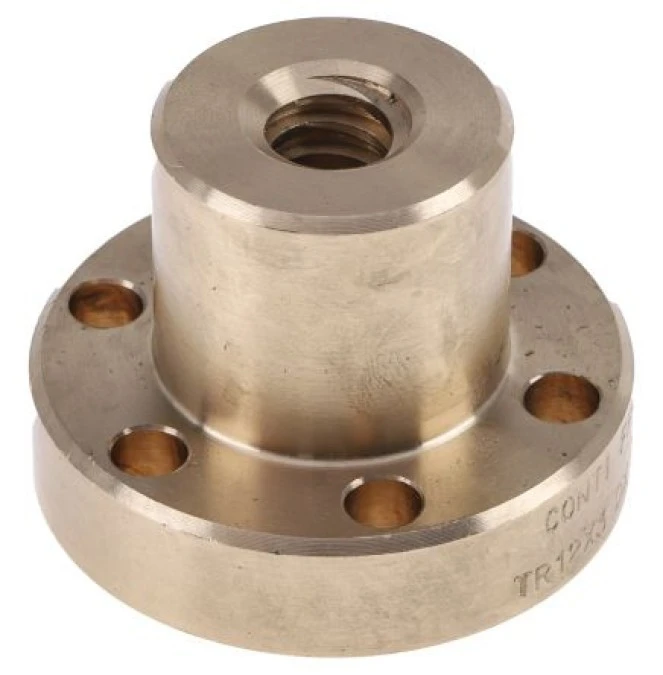 Typ nakrętki śruby pociągowej = Kołnierzowy okrągły Rozmiar przewodu = 3mm Do średnicy wału = 12mm Średnica zewnętrzna = 48mm Długość całkowita = 35mm Brązowa nakrętka z kołnierzem. Nakrętka z kołnierzem na pojedynczy początek, śruby z łbem trapezoidalnym. Wykonane z brązu o dobrej odporności na zużycie i przeznaczone do pracy w ruchu ciągłym.