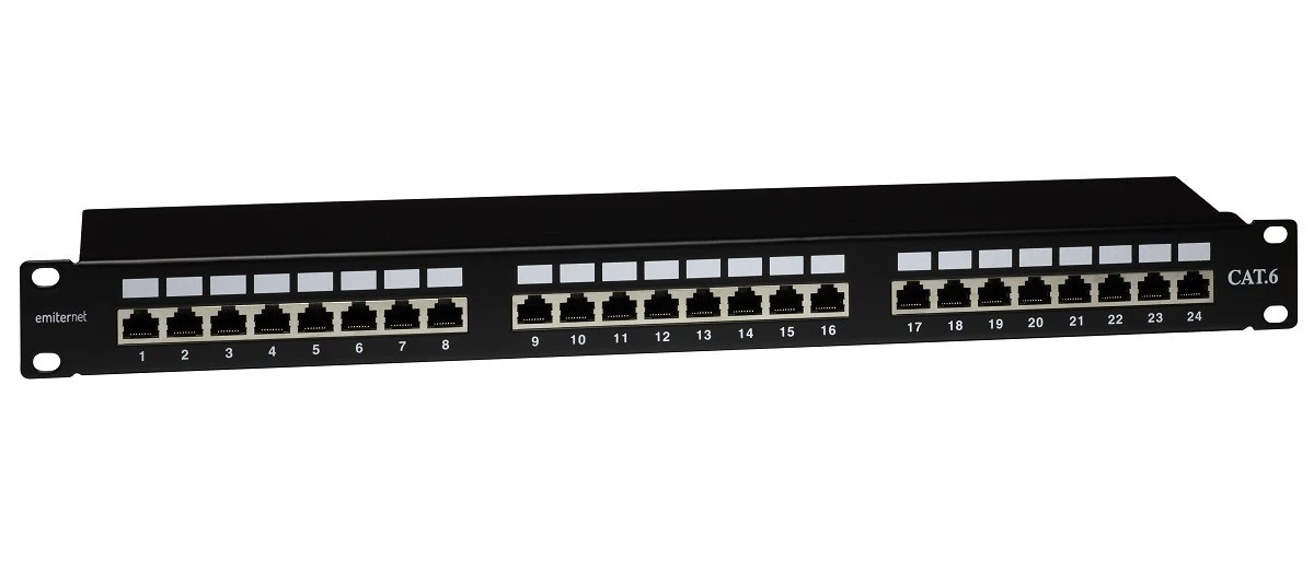 Panele krosowe ekranowane EmiterNet kat. 6 zbudowano w oparciu o moduły PCB 8 portowe z oznaczeniem kolorowym (568A/B), z frontowymi oznacznikami portów. W komplecie znajduje się zestaw śrub montażowych, krawatki kablowe oraz instrukcja instalacji. Panel posiada uchwyt montażowy w komplecie (półkę), który ułatwia organizację kabla. Standard 19", wysokość 1U - panel 24 portowy. Panel w kolorze czarnym.