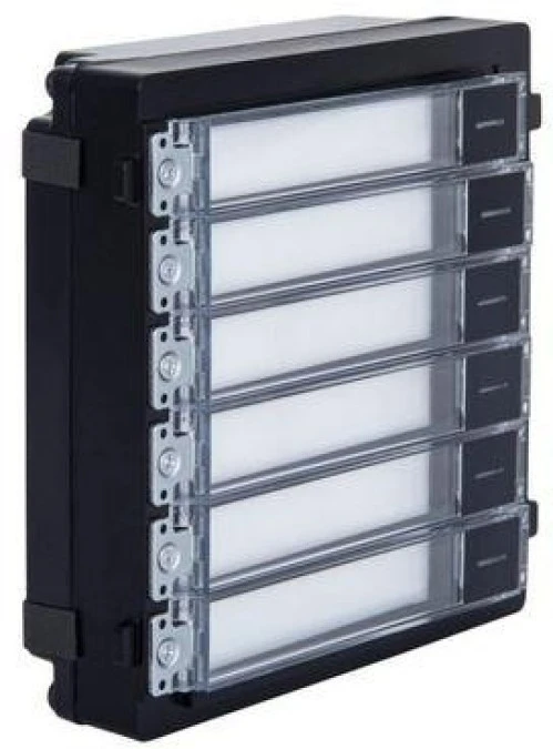 Przeznaczony do pracy w systemie Vidos ONE moduł przycisków wywołania. Wyposażony w 6 podświetlanych przycisków wraz z szyldami na nazwisko lub nazwę firmy. Wywołanie abonentów przy użyciu tego modułu odbywa się poprzez wybranie przypisanych do użytkowników przycisków. Podświetlenie LED zapewnia komfort użytkowania w warunkach niedostatecznej widoczności. A2000-N może pracować wyłącznie jako rozbudowa modułu głównego A2000-G i musi zostać zasilony przez port RS485.