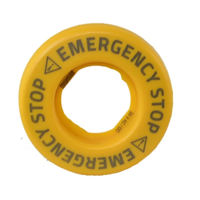 Pierścień z podświetleniem do przycisków awaryjnych z opisem EMERGENCY STOP, światło błyskowe, 60mm, zasilanie 24V AC/DC.