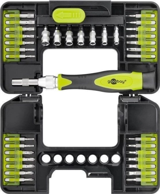 w zestawie 28 bitów: 6 bitów płaskich: 1 mm, 1,5 mm, 2 mm, 2,5 mm, 3 mm, 3,5 mm 4 bity krzyżakowe (Phillipsa): PH000, PH00, PH0, PH1 2 bity Pozidriv: PZ0, PZ1 9 bitów torx: T4, T5, T6, T7, T8, T9, T10, T15, T20 7 bitów sześciokątnych: H0.7, H0.9, H1.3, H2, H2.5, H3, H4 1 bit precyzyjny 100 mm w zestawie 7 nasadek sześciokątnych: 2,5 mm, 3 mm, 3,5 mm, 4 mm, 4,5 mm, 5 mm, 5,5 mm