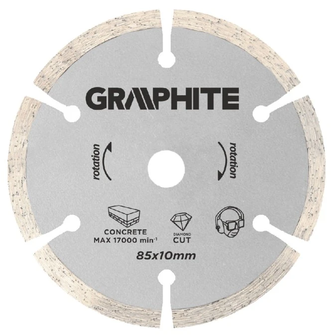 Tarcza diamentowa segmentowa GRAPHITE (nr ref. 55H550) o średnicy zewnętrznej 85 mm, przeznaczona dla minipilarki 500W (nr ref. 58G490)