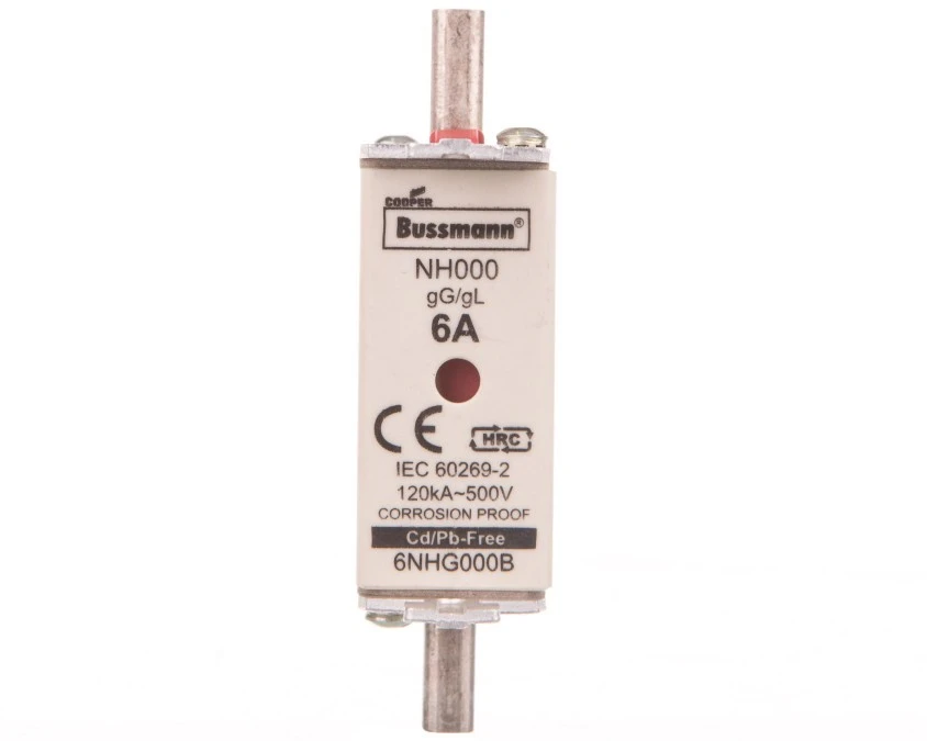 Wkładka bezpiecznikowa NH000 6A gL/gG 500V 6NHG000B Wkładka bezpiecznikowa Eaton 6NHG000B to niskonapięciowy bezpiecznik typu NH000 przeznaczony do ochrony instalacji i urządzeń przy napięciu znamionowym 500 V AC. Model o prądzie znamionowym 6 A i charakterystyce gL/gG znajduje zastosowanie w ochronie przewodów i aparatury w rozdzielnicach przemysłowych i energetycznych. Cechy techniczne