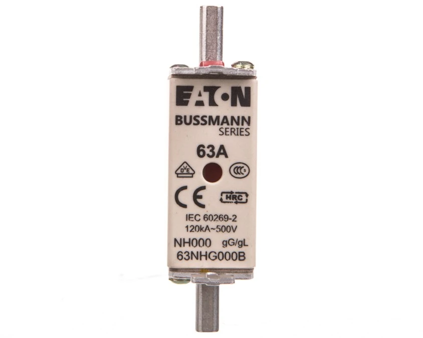 Wkładka bezpiecznikowa NH000 63A gL/gG 500V 63NHG000B Wkładka bezpiecznikowa Eaton 63NHG000B to niskonapięciowy bezpiecznik topikowy o przeznaczeniu do zabezpieczeń obwodów przemysłowych i rozdzielnic. Przeznaczona do montażu w podstawach serii NH, zapewnia ochronę przed przeciążeniami i zwarciami w układach do 500 V AC. Cechy techniczne