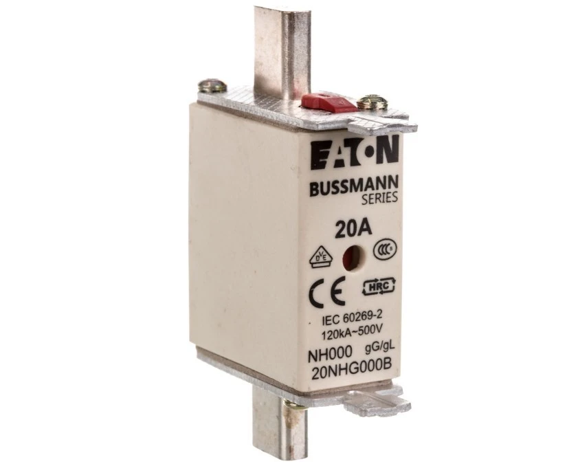 Wkładka bezpiecznikowa NH000 20A gL/gG 500V 20NHG000B Wkładka bezpiecznikowa Eaton 20NHG000B to wkładka rozmiaru NH000 przeznaczona do instalacji niskiego napięcia AC 500 V, o znamionowym prądzie 20 A i charakterystyce gL/gG do ochrony przed przeciążeniami i zwarciami. Cechy techniczne