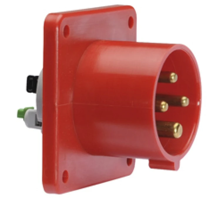 wtyczka odbiornikowa tablicowa Quick-Connect proste 16A 3P+PE 380 do 415V 6h IP44 50 i 60Hz, Kołnierz i otwory montażowe: kołnierz 75x75 Otwory motażowe 60x60, Kolor indentyfikacyjny: czerwony RAL 3000 (obudowa), Izolator/Kontakty: Izolator z PA6 kon