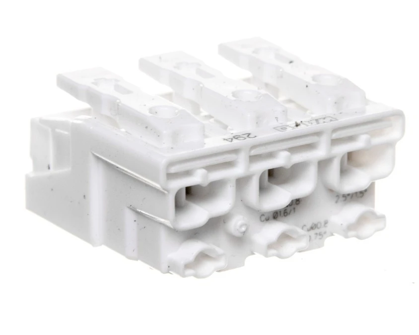 Złączka zasilająca 3-biegunowa bez stopek bez styku PE 294-4003 /25szt./ Złączka zasilająca 3-biegunowa 294-4003 przeznaczona do przyłączania przewodów w instalacjach oświetleniowych i urządzeniach elektrycznych; konstrukcja bez styku PE zapewnia trzy izolowane potencjały w kompaktowej obudowie. Cechy techniczne