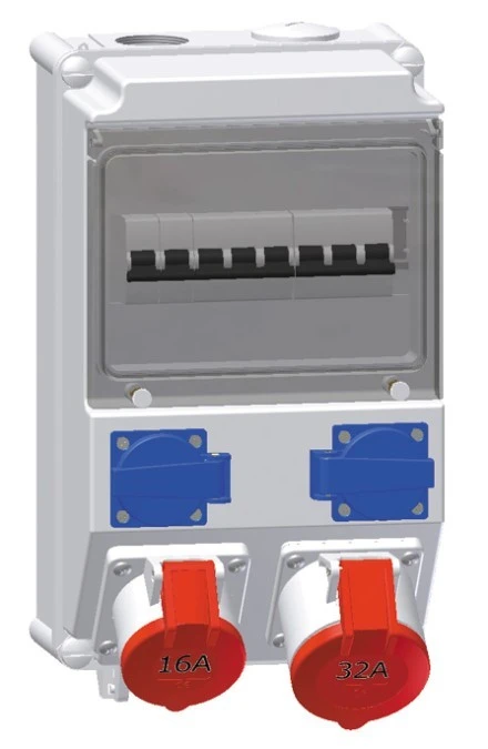 Rozdzielnica naścienna 2x16A 230V, 1xCEE 16A 5P 400V, 1xCEE 32A 5P 400V, 2xB16/1, 1xC16/1, 1xC32/3, IP44 518123