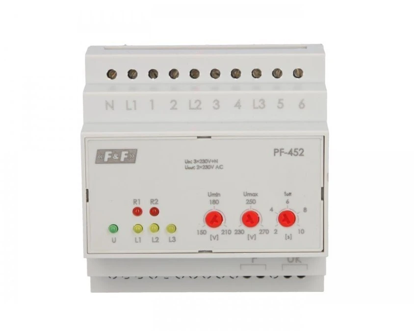 Automatyczny przełącznik faz PF-452 służy do zachowania ciągłości zasilania obwodu dwufazowego w przypadku zaniku lub spadku parametrów jednej z faz zasilających.