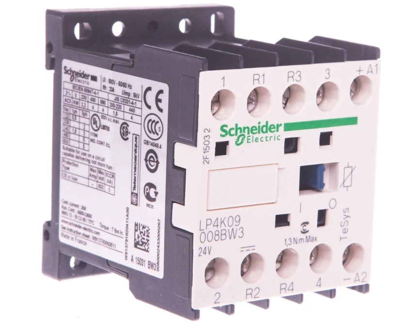 Stycznik TeSys K, 4 biegunowy (2NO+2NC), do aplikacji sterowania obciążeniem nieindukcyjnym do 20A/690V AC-1. Posiada cewkę o niskim poborze prądu 24V DC z modułem tłumienia stanów przejściowych, bez wbudowanego styku pomocniczego, podłączenie za po mocą zacisków śrubowych. Zapewnia niezawodność i trwałość w standardowych zastosowaniach przy szybkości pracy do 600 cykli/godzinę w AC-3 i środowisku do 50°C. Bardzo kompaktowy (45mm szerokości), montaż na szynie DIN lub przykręcenie. Posiada certy fikaty wielu norm (IEC, UL, CSA, CCC, EAC), zgodność z Green Premium (RoHS/REACh). Green Premium pozwoli spełnić Twoje zobowiązania w zakresie zrównoważonego rozwoju, zapewniając produktom zgodność z przepisami dotyczącymi ochrony środowiska, takimi jak RoHS i REACH, a także doskonałą przejrzystość w kwestii ujawniania informacji o środowisku i instrukcji dotyczących zakończenia eksploatacji.