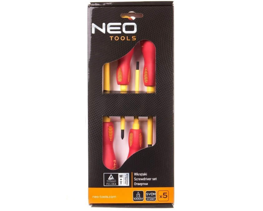 zestaw 5sztuk wkrętaków, odporność na zgięcia 56HRC, trójgraniasty kształt uchwytu, wyprofilowane oparcie dla kciuka, posiada certyfikat TUV, 25‑letni okres ochronny marki NEO.