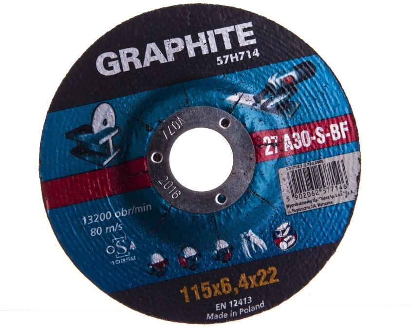 Tarcza do szlifowania metalu GRAPHITE (nr ref. 57H714) o średnicy zewnętrznej 115 mm, posiada bardzo wysoką odporność na uszkodzenia w trakcie pracy dzięki zastosowaniu potrójnej warstwy siatek wzmacniających. Zapewnia wysoki poziom bezpieczeństwa pracy dzięki zgodności produktu z normą EN12413.
