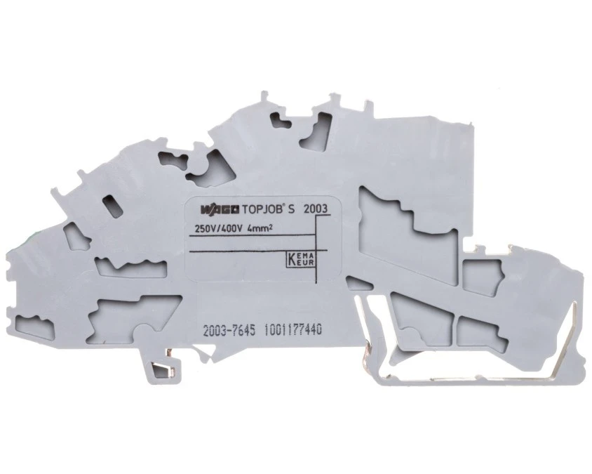 Złączka szynowa 3-pietrowa 2,5mm2 L/L/PE szara 2003-7645 TOPJOBS Złączka piętrowa TOPJOB® S 2003-7645 przeznaczona do rozdziału i łączenia trzech potencjałów (L/L/PE) w instalacjach na szynie DIN 35 mm; stosowana w rozdzielnicach, panelach sterowniczych i aplikacjach przemysłowych wymagających modułowych bloków zaciskowych. Cechy techniczne