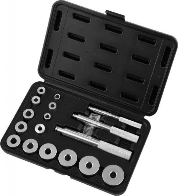 Dane techniczne: Symbol: YT-25415 Seria: GRD Materiał: aluminium 6066 Zastosowanie: do osadzania łożysk i uszczelniaczy Zawartość zestawu: trzpień x3 (O11x115 mm, O16x140 mm, O21x160 mm)|adaptor x14 (O10x12, O12x14, O14x16, O15x17, O16x18, O18x20, O20x22, O22x24, O25x27, O28x30, O30x34, O32x36, O35x40, O38x42 mm) Liczba sztuk w zestawie: 17 Zestaw stosowany do równoosiowego montażu łożysk, pierścieni, uszczelniaczy, tulei i wałków tocznych. Pasuje do większości modeli samochodów osobowych. Zestaw zawiera: 3 sztuki trzpieni: O 11x115 mm, 16x140 mm, 21x160 mm 14 sztuk adaptorów o rożnych średnicach: 10/12, 12/14, 14/16, 15/17, 16/18, 18/20, 20/22, 22/24, 25/27, 28/30, 30/34, 32/36, 35/40, 38/42 mm Materiał: aluminium 6066. **