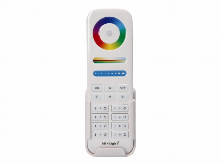 Pilot FUT089 Mi-Light to pilot przeznaczony do obsługi wszystkich produktów Mi-Light . Pilot pracuje w systemie 8-strefowym . Do każdej strefy można przypisać dowolną ilość produktów . Pilot umożliwia płyną regulację jasności, koloru światła, temperatury barwowej światła białego oraz saturacji . Pilot jest zasilany bateriami 2 x AAA.