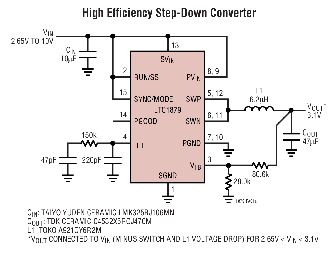 The internal synchronous rectifier switch increases efficiency and eliminates the need for an external Schottky diode. Low output voltages are easily supported with a 0.8V feedback reference voltage. The LTC1879 is available in a 16-lead SSOP package.