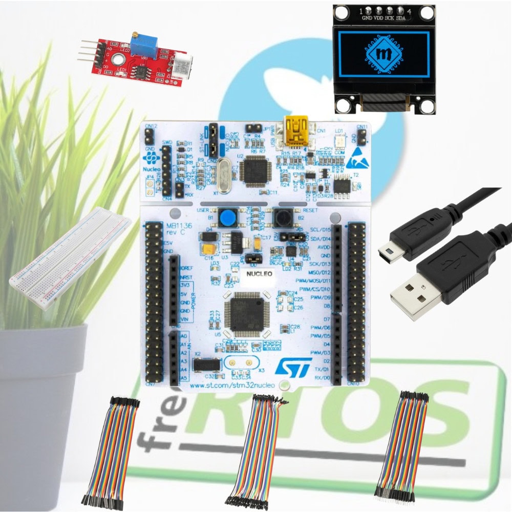 Jest to kompletny zestaw sprzętu do kursu FreeRTOS na STM32 dla Początkujących, nauki mikrokontrolerów i systemów wbudowanych — zawiera płytkę deweloperską STM32 NUCLEO-F411RE Nucleo-64 oraz najczęściej wykorzystywane peryferia: wyświetlacz OLED, mikrofon z wzmacniaczem, przewody połączeniowe Ż-Ż, przewody połączeniowe M-M, przewody połączeniowe Ż-M, płytkę stykową i kabel USB.