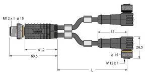 2-drożne systemy rozdzielaczy, rozdzielacz Y z kablem, wtyk M12x1 - 2x złączka M12x1, długość kabla 1,5 m, materiał płaszcza: PUR, kolor płaszcza: czarny, nadaje się do łańcuchów kablowych, odporny na chemikalia, promieniowanie UV i olej, trudnopalny (FT2 zgodny z UL 1581, IEC 60332 -2-2), nie zawiera halogenów, silikonu, PVC i PWIS, szczególnie odporny na ścieranie, zgodny z RoHS, stopień ochrony: IP67, 4/3-pin, długość kabla: 1,5 / 1,5 metra