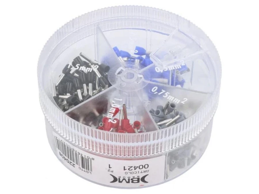 Producent: BM GROUP Typ zestawu: końcówki tulejkowe Rodzaj końcówki: izolowana Długość końcówki: 8mm Przekrój przewodu: 0,5mm²/0,75mm²/1mm²/1,5mm²/2,5mm² Liczba sztuk w zestawie: 400