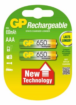 2 akumulatorki Ni-MH R03/AAA 650 wyprodukowane przez jednego ze światowych liderów w dziedzinie produkcji akumulatorków i baterii - firmę GP Batteries.