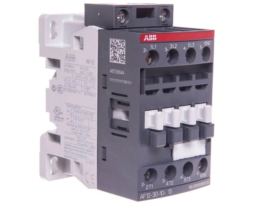 Stycznik mocy 12A 3P 5,5kW 100-250V50/60HZ-DC 1Z 0R AF12-30-10-13 1SBL157001R1310 Stycznik mocy AF12-30-10-13 (1SBL157001R1310) przeznaczony do sterowania trójfazowymi napędami elektrycznymi. Urządzenie klasy AF stosowane w instalacjach przemysłowych i na jednostkach pływających do załączania silników w kategorii AC-3.