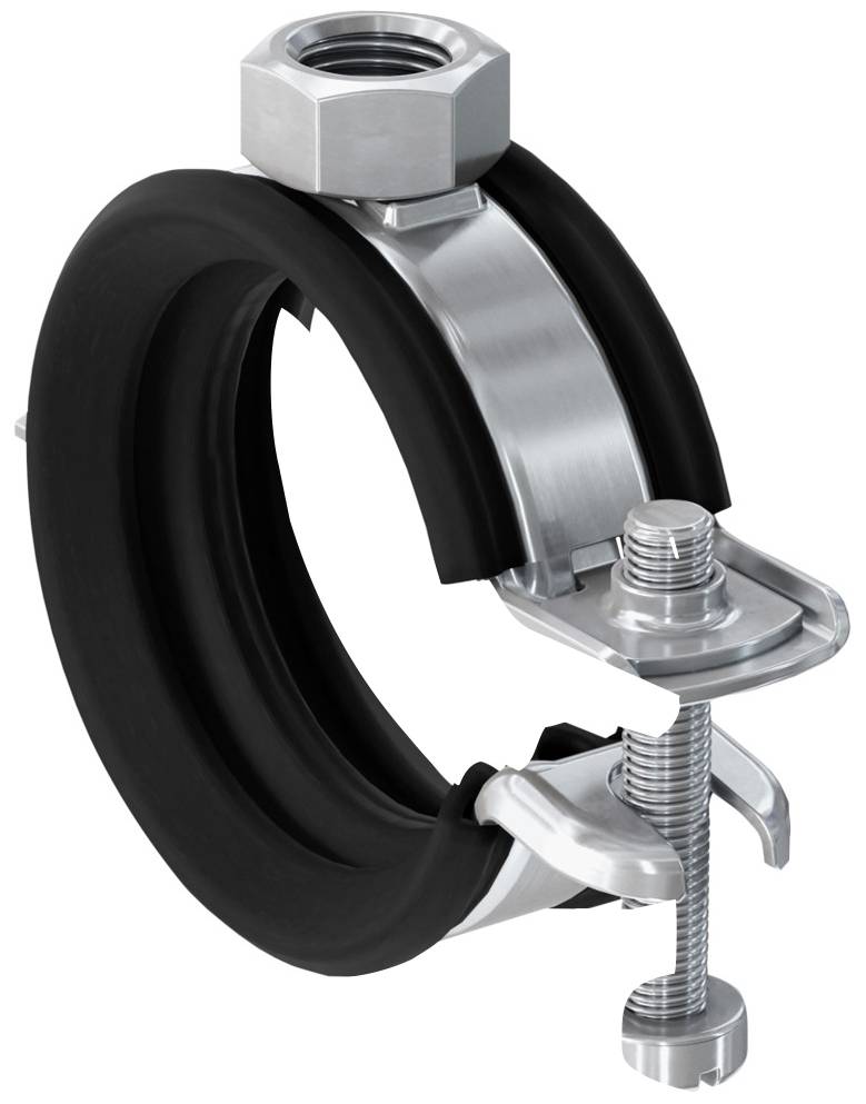 Przegubowy zacisk rurowy fischer FGRS Universal to zacisk rurowy ze śrubą wykonany ze stali ocynkowanej o jakości materiału DD11 z kombinowanym gwintem przyłączeniowym M8/M10 lub gwintem M8. Szybkozamykacz i kombinowany gwint przyłączeniowy umożliwiają prosty i oszczędzający czas montaż.Zatrzaśnięcie szybkozamykacza gwarantuje pewne dopasowanie rury bez sprężynującego otwierania obejmy. Pozwala to na pewne mocowanie rur o średnicy zewnętrznej 12 - 66 mm wewnątrz pomieszczeń za pomocą pręta gwintowanego lub śruby dwugwintowej. Dzięki wkładce dźwiękochłonnej niezawierającej chloru i silikonu obejma rurowa spełnia wymagania normy DIN 4109.