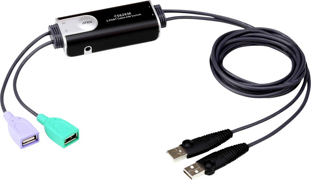 ATEN CS62KM to 2-portowy przełącznik KM z kablem USB, który umożliwia użytkownikom sterowanie maksymalnie 2 komputerami za pomocą jednej klawiatury i myszy.