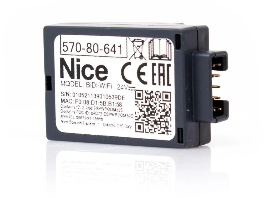 Moduł-programator NICE BiDi WiFi Model: BIDI-WIFI Krótki opis: urządzenie służące do konfiguracji siłownika, pomocne przy jego montażu, konfiguracji, czy diagnostyce. Moduł do programowania centralek Nice aplikacją MyNice Pro.
