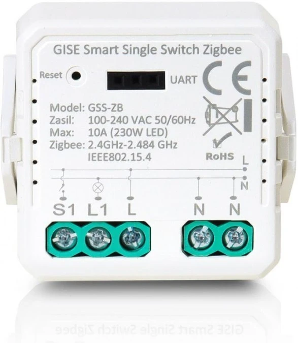 GISE Smart Pojedynczy moduł przekaźnikowy Zigbee | Tuya | GSS-ZB Gise SMART Single Switch - pojedynczy przekaźnik oświetleniowy Zigbee kompatybilny z aplikacją TUYA Doskonały przekaźnik dopuszkowy - steruj każdym sprzętem 100-240V, zautomatyzuj swoje klasyczne włączniki światła! Przekaźnik pozwala na bezprzewodowe działanie poprzez protokół Zigbee Urządzenie współpracuje z przełącznikami monostabilnymi oraz bistabilnymi! Deklarowany zasięg działania = do 200m Darmowa aplikacja TUYA na iOS i Android Możliwość tworzenia scen w aplikacji TUYA SMART Możliwość podpięcia obciążenia do 1 x 10A / ok 1 x 230W dla LED Możliwość działania z asystentem GOOGLE, ALEXA i innymi popularnymi asystentami głosowymi Współpraca z systemem Google Home Model: GSS-ZB