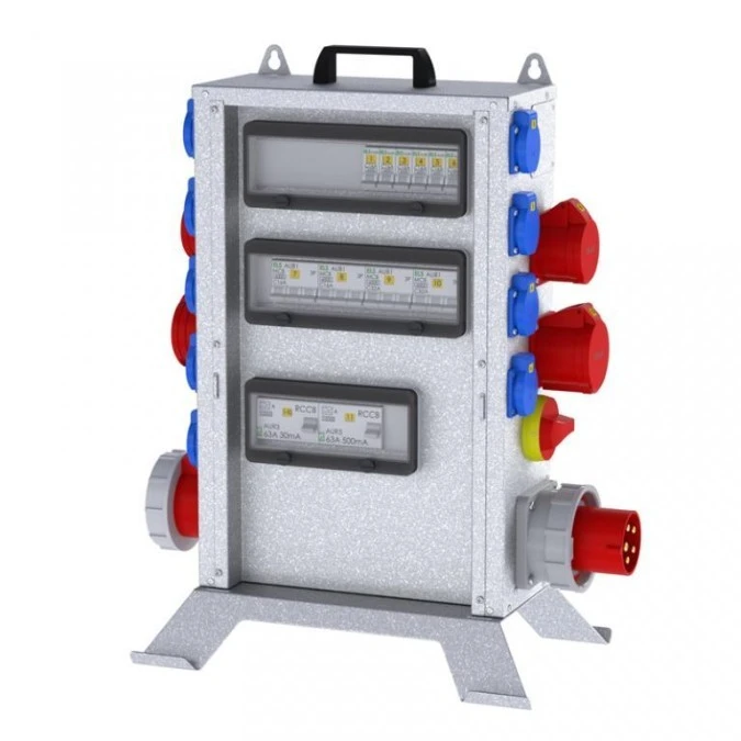 Specyfikacja techniczna: - wtyk CEE 63A - gniazda: 9szt. GK 230V 16A, 2szt. CEE 16A, 2szt. CEE 32A, 1szt. CEE 63A - Aparatura ELS, wyłączniki RCCB 10kA typu A, MCB 6kA - materiał obudowy: stal powlekana AlZn - stelaż: stojak - materiał stelaża: stal nierdzewna - wysokość: 660 mm - szerokość: 525 mm - głębokość: 160 / 283* mm (* głębokość po rozstawieniu stojaka) - waga: 14,5 kg - stopień ochrony: IP44
