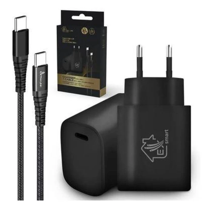Extralink Smart Life | Zestaw USB Type-C to Type-C, 200cm, Czarny + Ładowarka 18W PD3.0 | Czarna